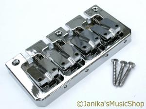 A heavy duty chrome plated 4 string bass guitar bridge.