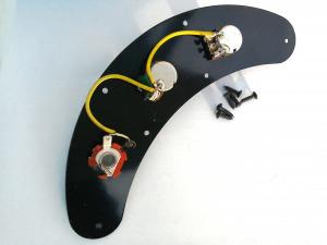 BASS GUITAR CONTROL PLATE 2 POTS BLACK LOADED MUSIC MASTER — premium-quality part from Janika.co.uk. A curved panel with two pots, one capacitor and a jack socket.