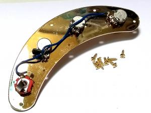 BASS GUITAR CONTROL PLATE 3 POTS GOLD LOADED MUSIC MAN STYLE — premium-quality part from Janika.co.uk. A curved panel with three 500kohm pots, one 47nF capacitor and a jack socket.