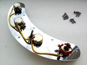 BASS GUITAR CONTROL PLATE 3 POTS LOADED MUSIC MASTER — premium-quality part from Janika.co.uk. A chrome curved panel with three 500kohm pots, one 47nF capacitor and a jack socket.