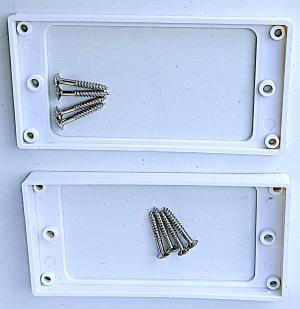 PAIR LES PAUL ELECTRIC GUITAR PICKUP SURROUNDS RINGS WHITE WITH CHROME SCREWS — premium-quality part from Janika.co.uk. These surrounds are curved to fit the rounded body of a Les Paul type of guitar.