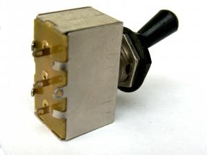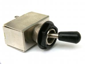 The switch is fitted with a black knob. Held in place by two steel nuts and a washer to allow fitting to various thicknesses of wood or plastic.
