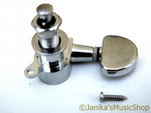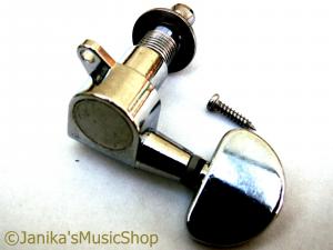 A set of six individual chrome plated machine heads as fitted to acoustic and electric guitars.