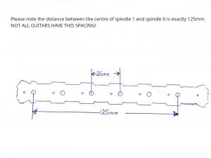 The chrome fixing plates are 165mm long. The first fixing hole is 7mm from the end nearest to the guitar nut. Subsequent holes are 25mm apart - total 7 holes.