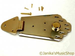 A gold plated guitar tailpiece/anchor for acoustic or semi-acoustic guitar.