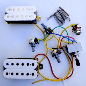 Flying V guitar pre-wired wiring harness. This includes two humbucker pickups wired to two tone and one volume control, a three way pickup slector switch, and an output jack. These parts will fit a standard flying V guitar pickguard and no soldering is required.